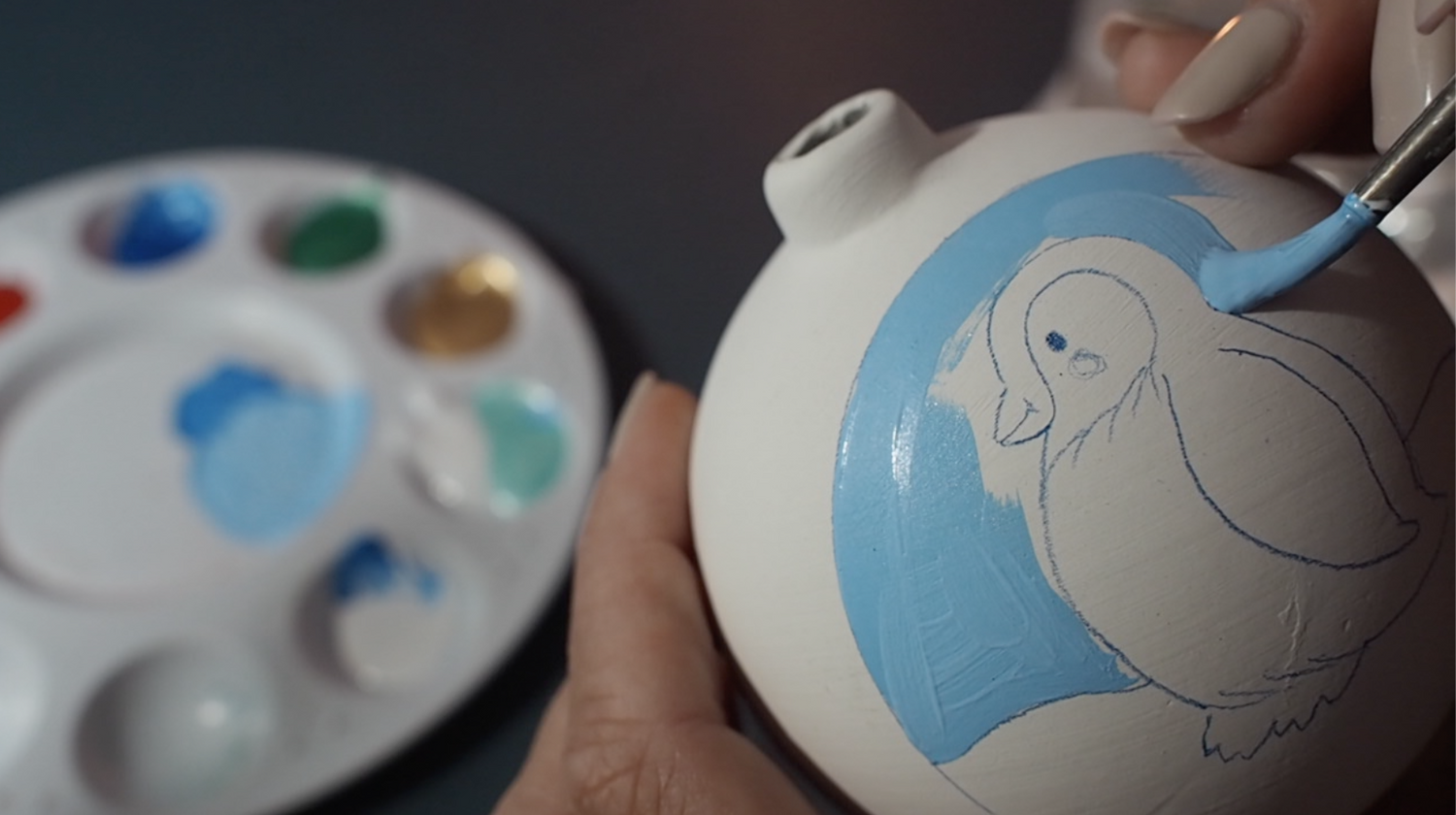 Next they are drawn by hand on to the blank ceramic bauble. The bauble in it's raw state is referred to as 'green', where it has been fired in the kiln for the first time to form a solid round object.