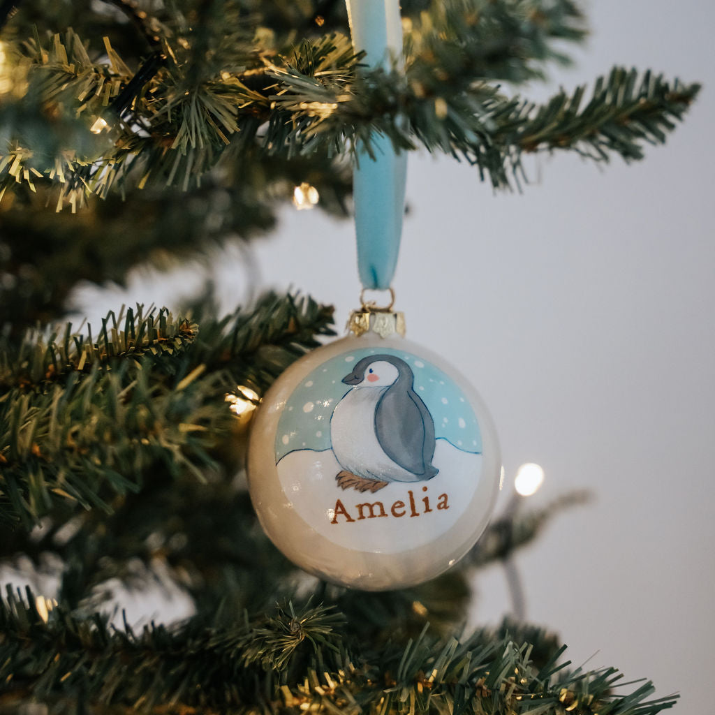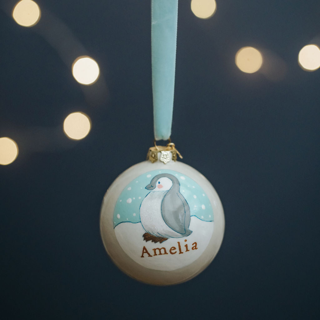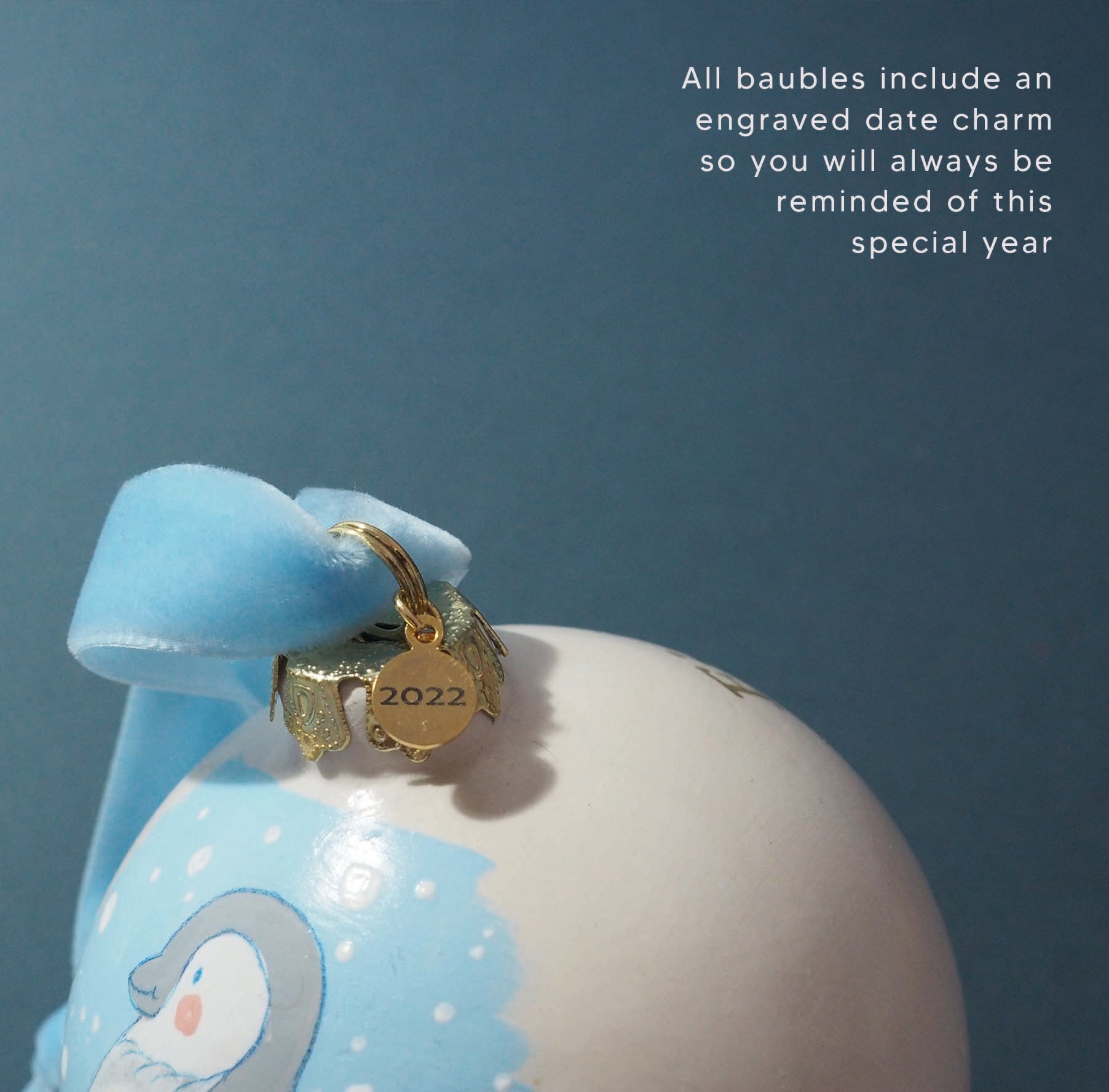 Whether it's Baby's First Christmas, or their second or third, this unique hand-painted personalised bauble is the perfect way to celebrate a special family Christmas. This Baby's First Christmas decoration depicts a cute baby penguin and snowy scene, finished with the baby's name and a personal message on the back, this makes this the perfect heirloom gift for baby and their family.