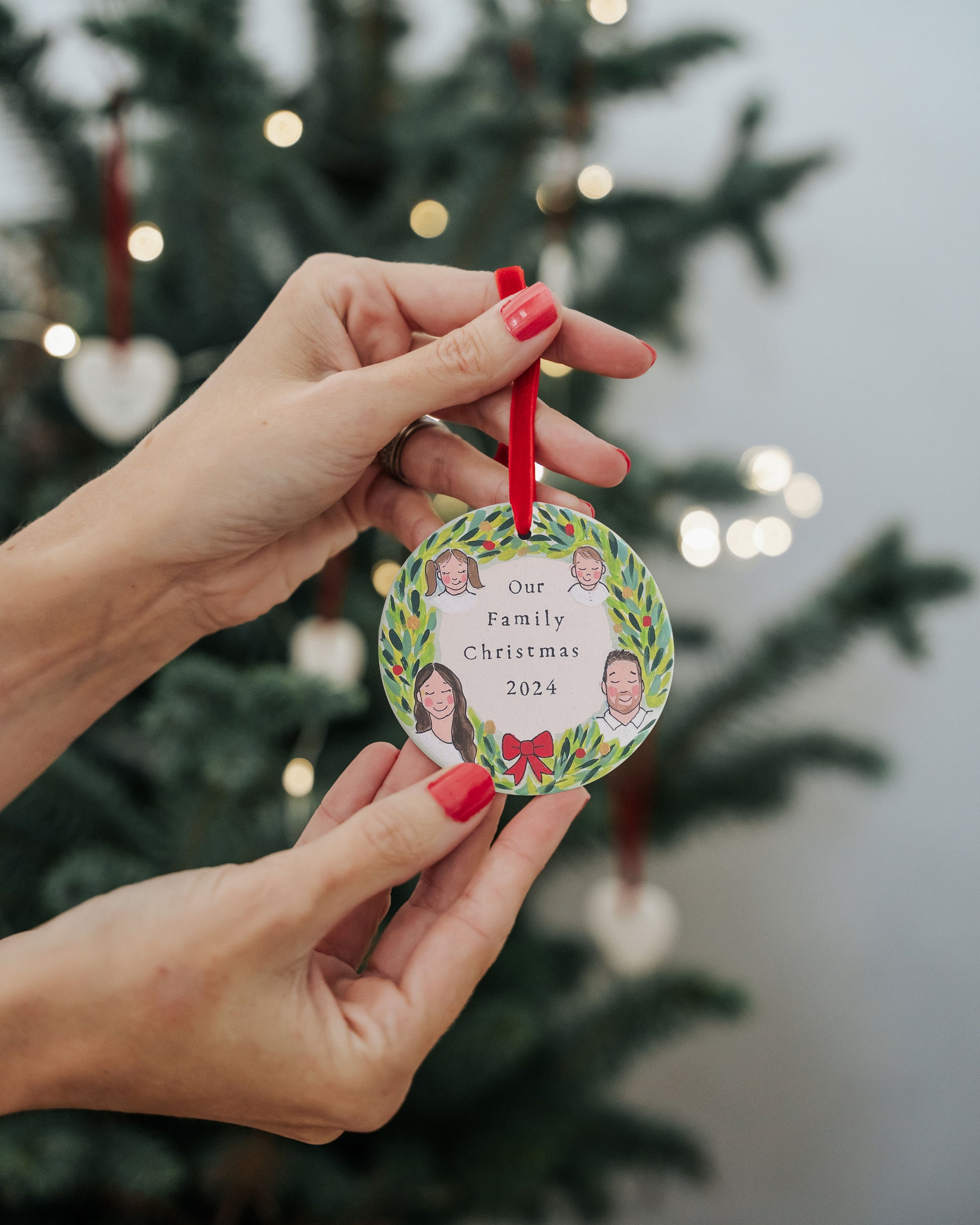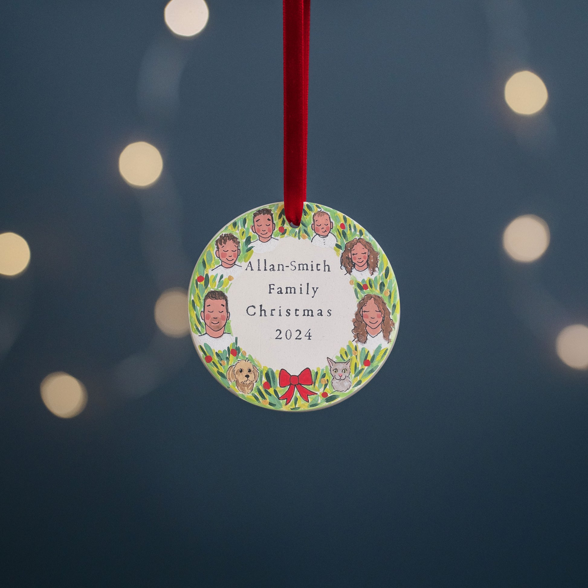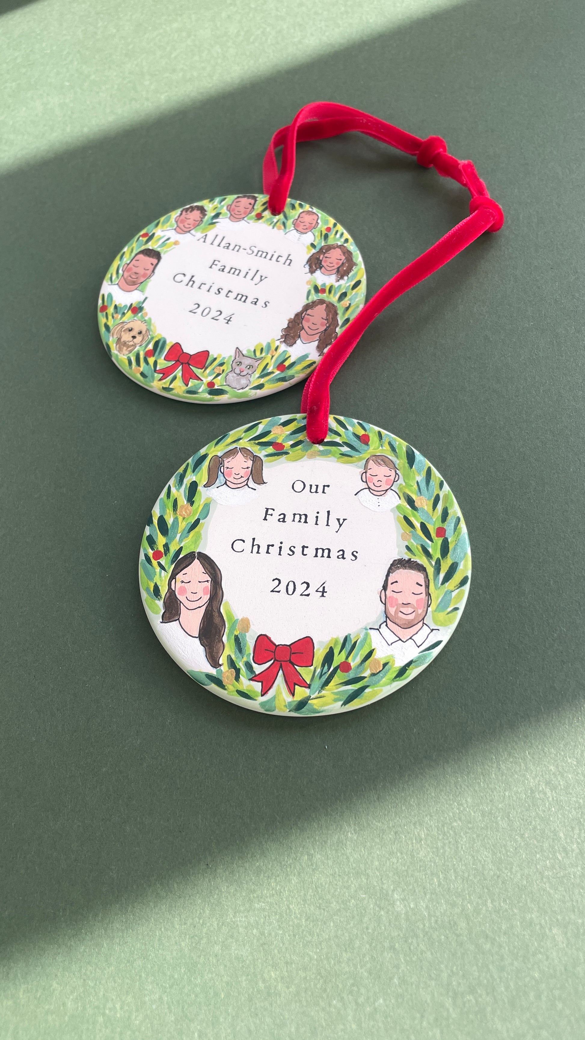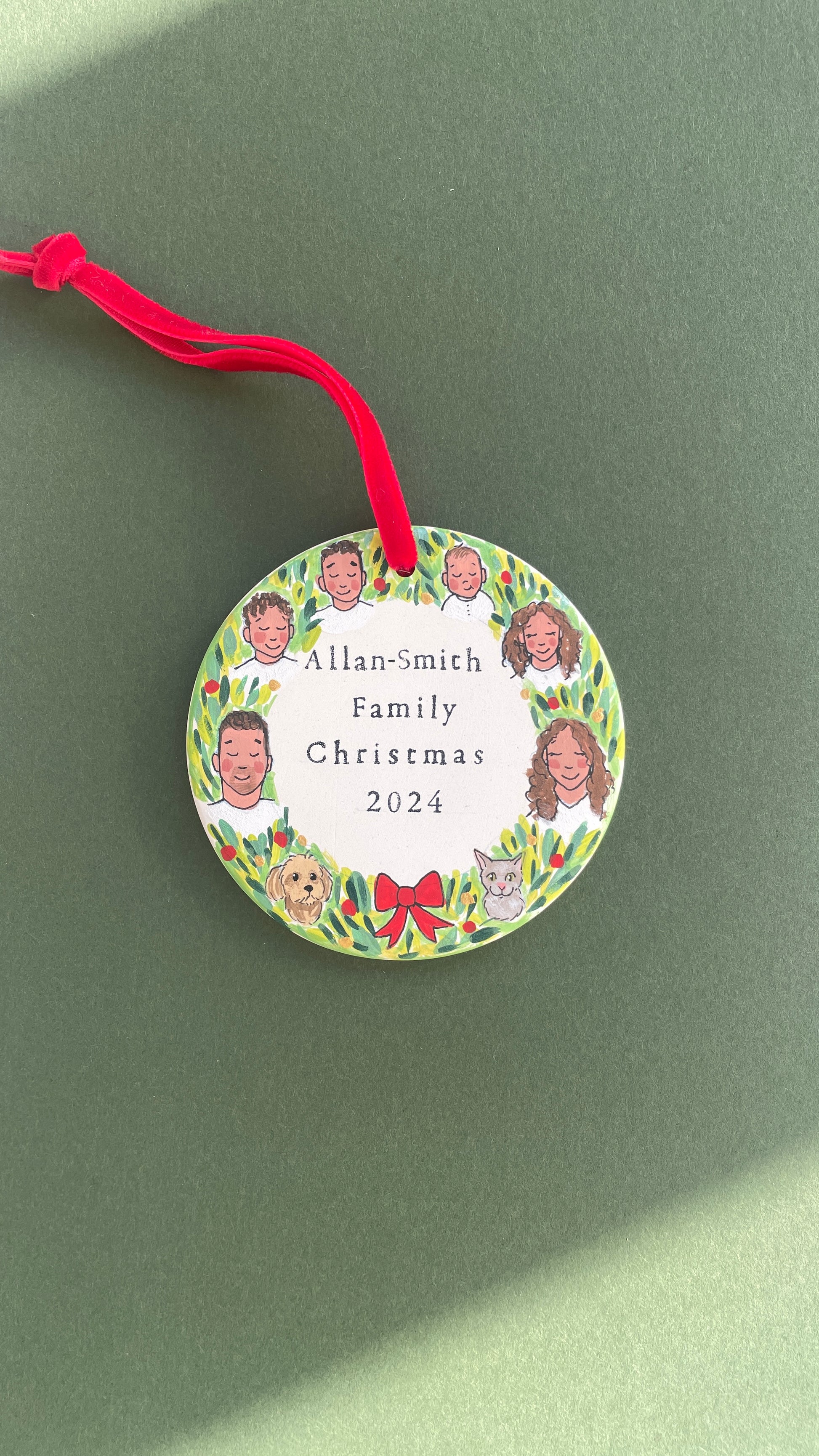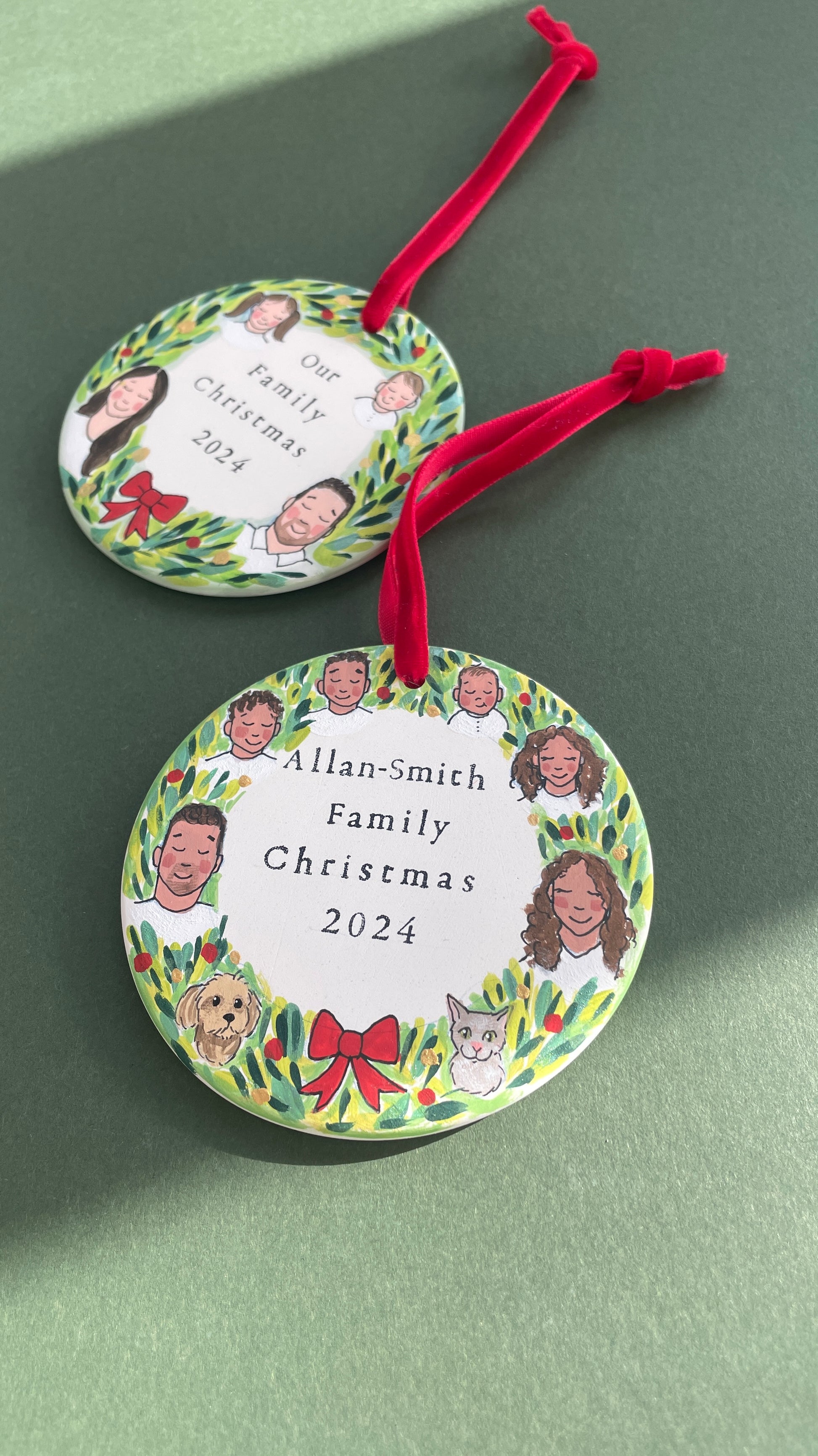 Our bestselling Family Portrait Bauble has been reincarnated in this smaller, daintier, but equally as special, flat bauble. Send me photos of each family member including pets, and I will individually hand paint each of them into this beautiful wreath design. Choose your own wording for the centre too.