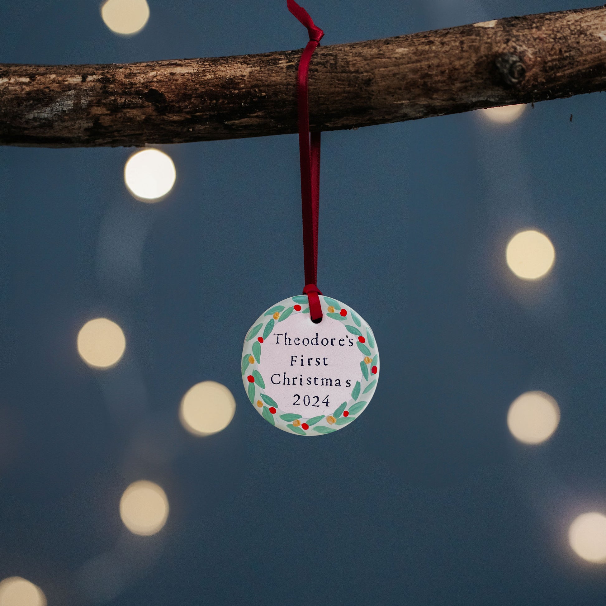 Hand-made from super fine, ultra-white Alpha earthenware clay from Stoke-On-Trent. Unglazed and finished with a luxurious red ribbon, and comes safely packaged in a gift box. Please store in the gift box when packing the bauble away to protect the design.